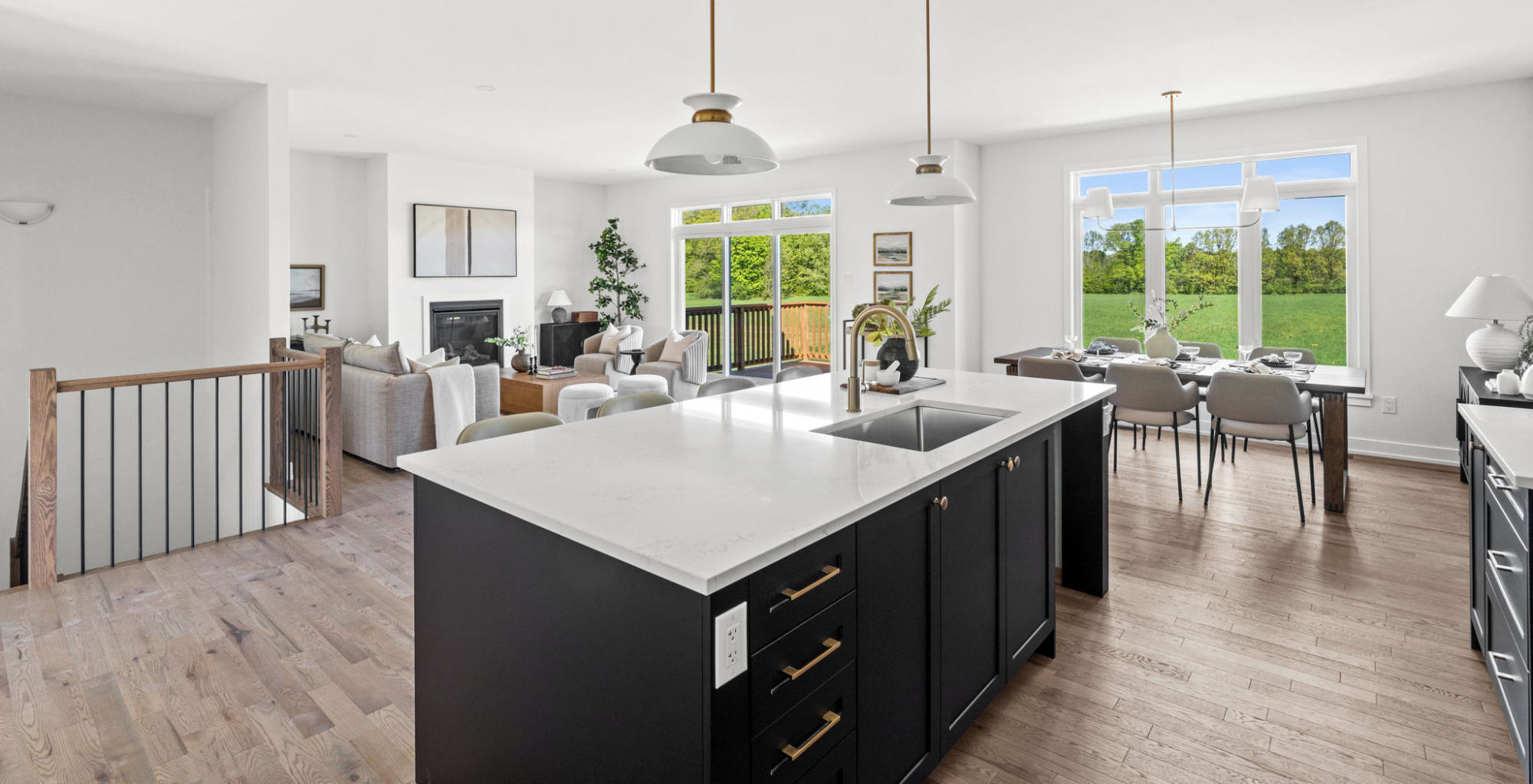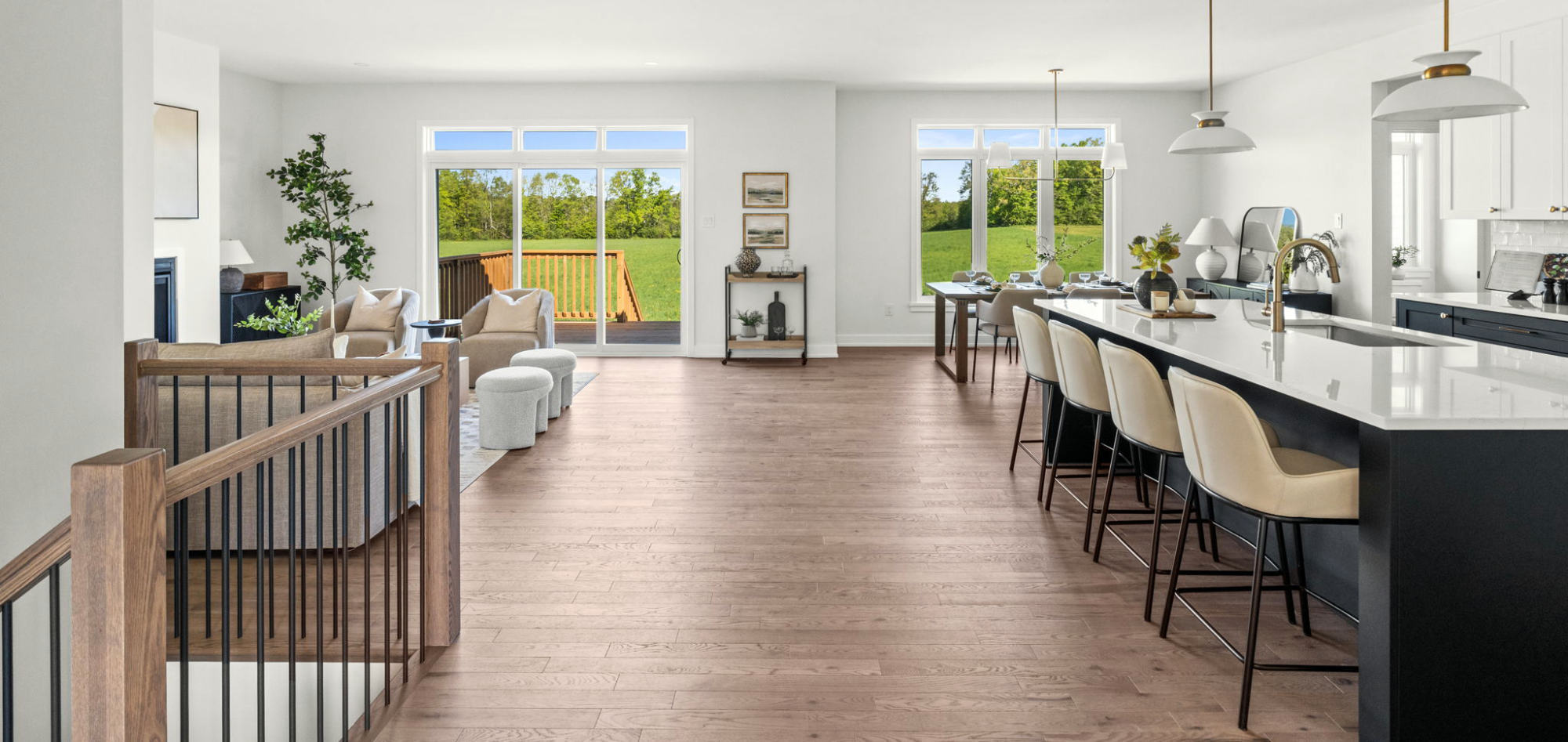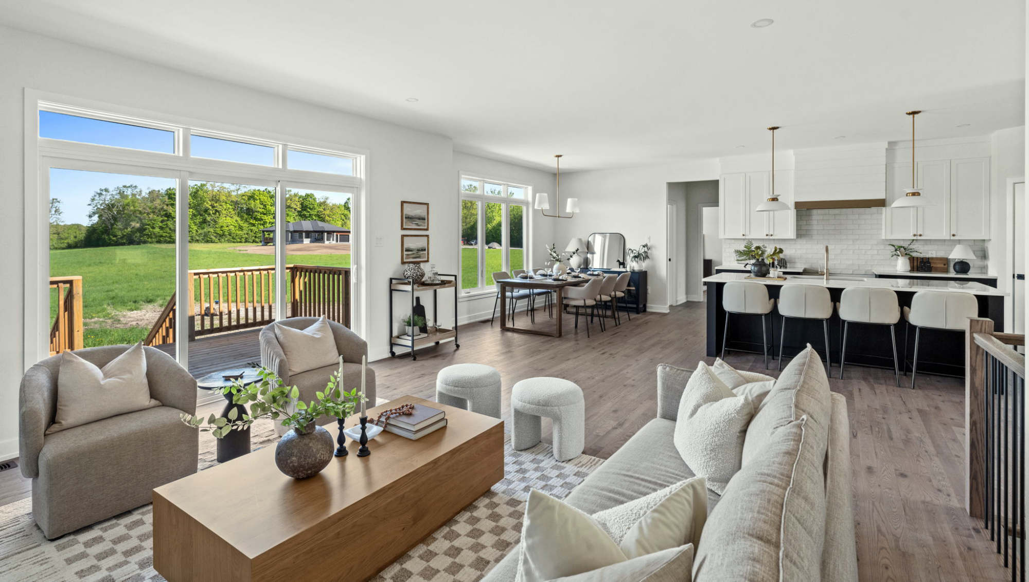 For this model home, we layered in personality and warmth to create a space that feels vibrant, inviting, and full of life. Trendy touches like our checkered rug and a styled dining table set for six adds visual interest while defining each area with intention. Lots of decor and each corner utilized gives a sense of live-in comfort. Every detail was selected to showcase how the home can feel both on-trend and welcoming, helping buyers envision gatherings, conversations and everyday moments unfolding in a cozy, fully realized space designed for connection.